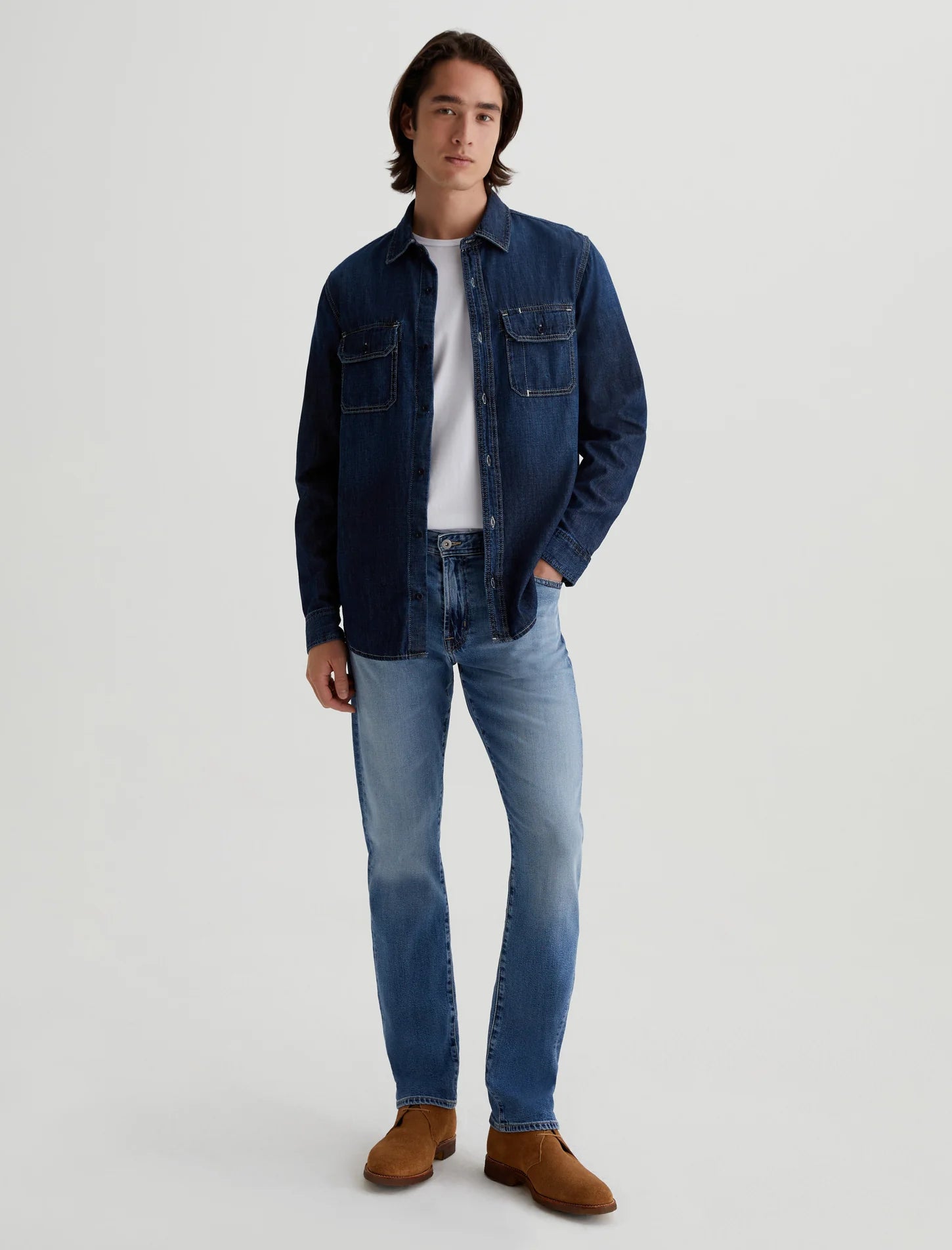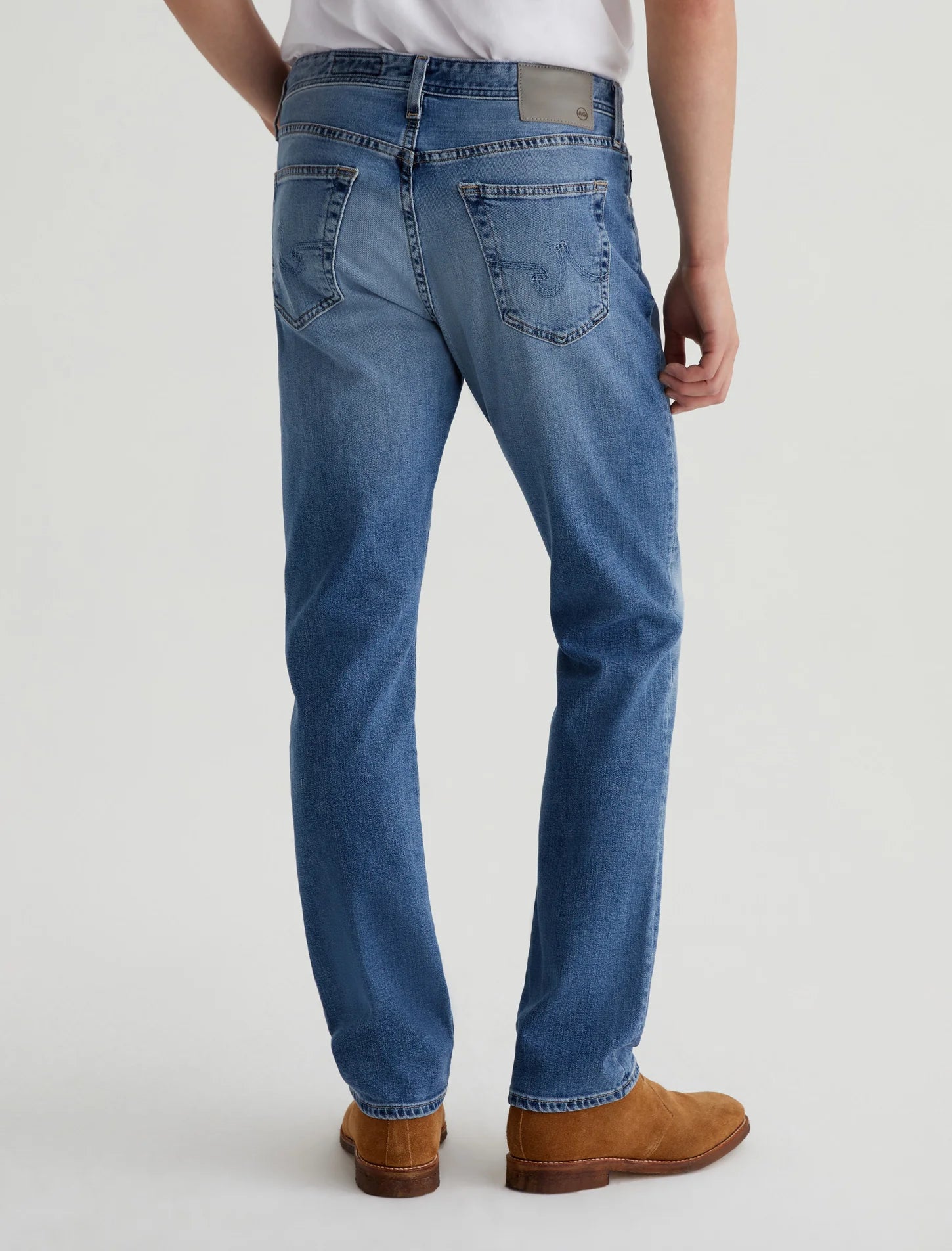 - Details: AG's Everett slim-straight men's jeans have a medium indigo wash with fading and hazy whiskering, the style is cut with a comfortable mid-rise waist and a straight fit that’s relaxed from hip to knee before slightly tapering at the leg opening, this pair has a soft, easy-wearing feel in lightweight 10 oz. Daytripper Stretch Denim from Japan