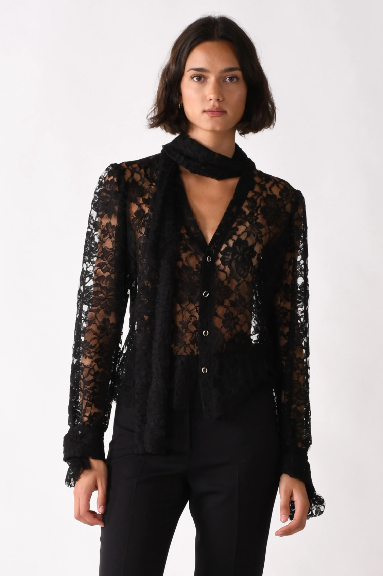 - Details: The black lace Bow Tie Blouse features an attached soft tie that can be styled in multiple ways, finished with a scalloped hemline and decorative black and brass buttons, cut with single-needle construction, leaving the tie and hem raw for a natural finish