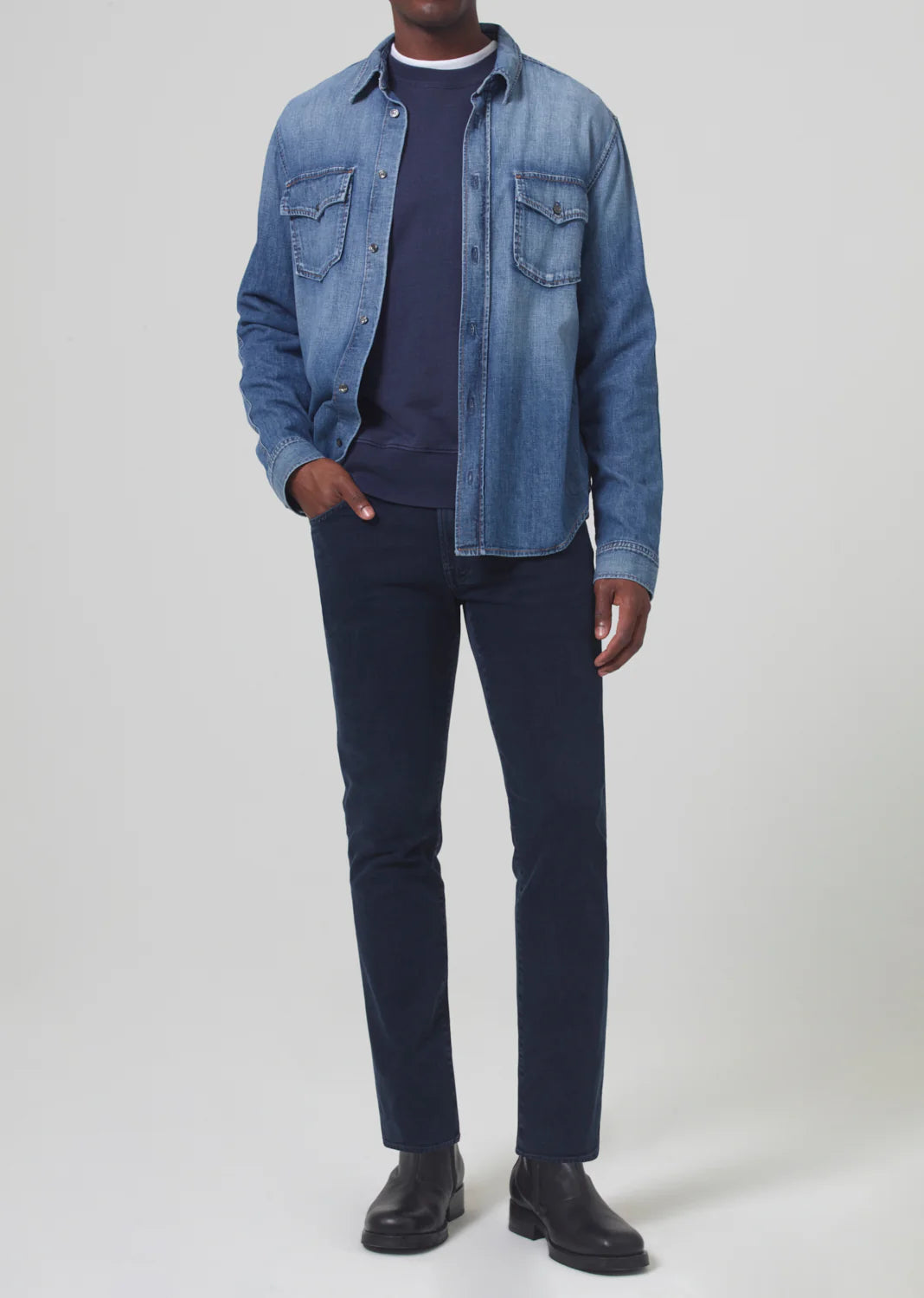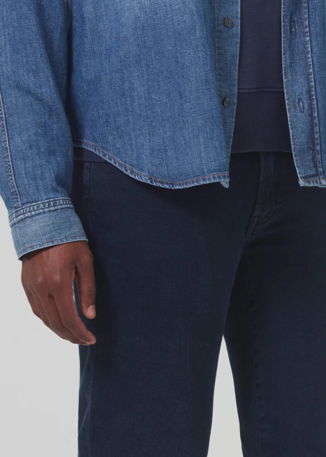 - Details: Slim straight, relaxed through the thigh, with a gradual taper to the ankle, this is great for an athletic build, deep clean dark indigo, heavy weight comfort stretch denim