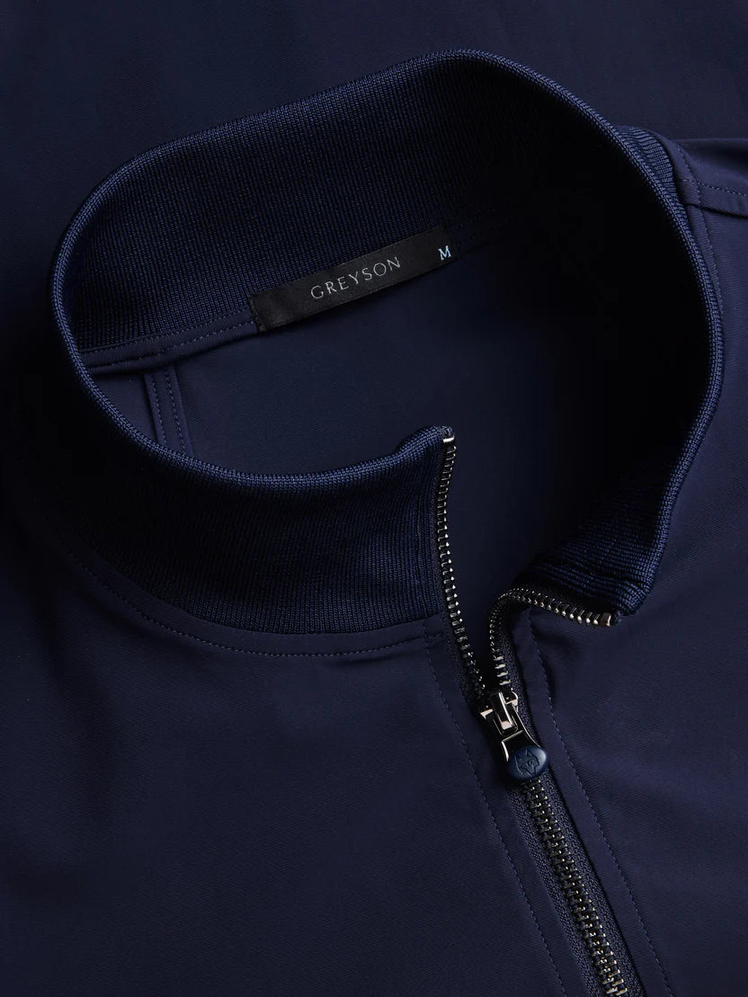 - Details: The Montauk Bomber Jacket is a modern full-zip layer made from Italian-sourced fabric with natural stretch and a smooth, structured hand, designed with zippered hand pockets and a subtle flap closure, it offers utility without compromising its clean silhouette, ribbed detailing at the collar and hem adds a classic finish, while low-profile snap cuffs ensure a tailored fit, completed with signature Greyson back paneling and an icon wolf metal rivet below the right pocket