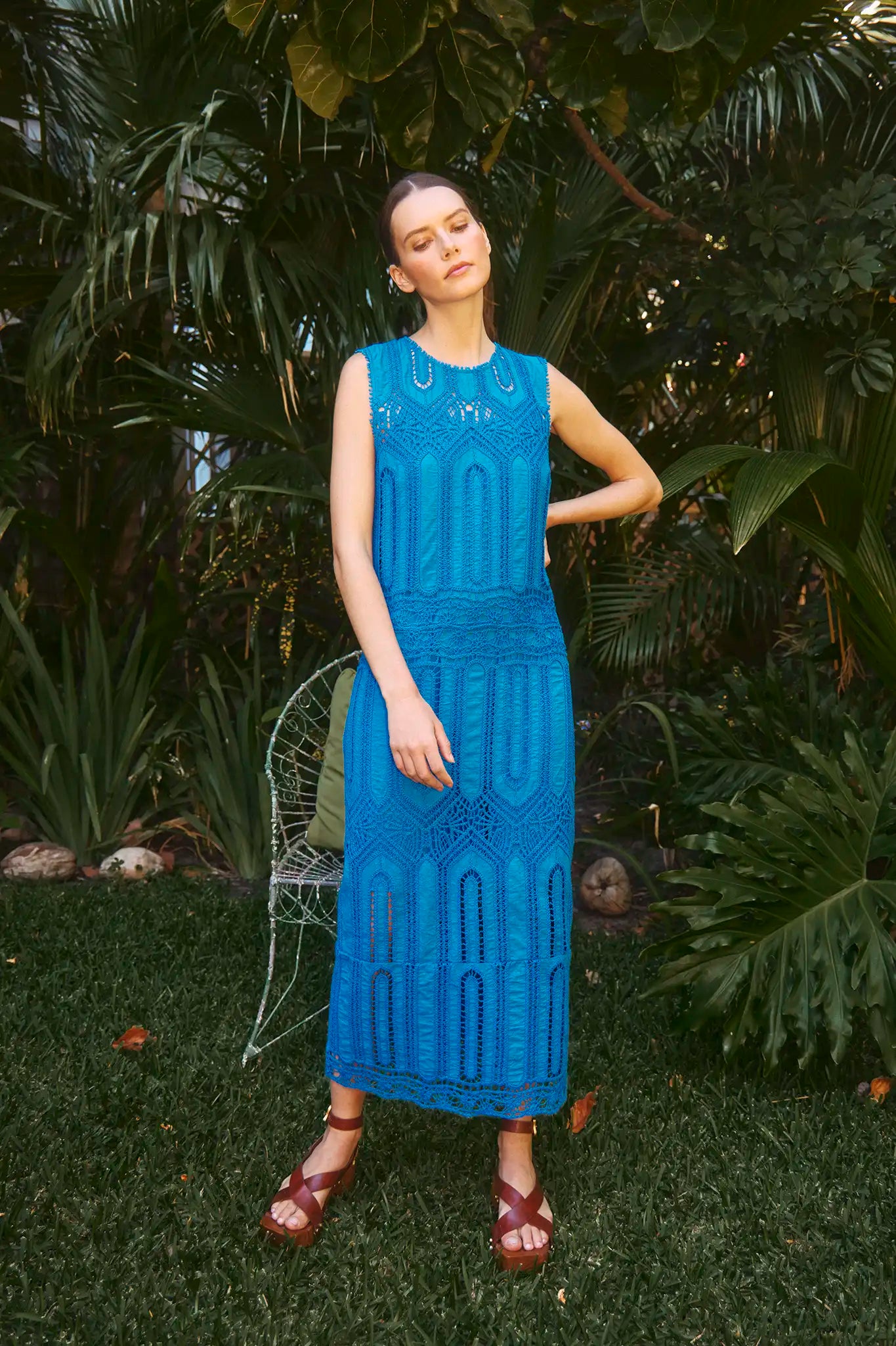 - Details: The Stowe Dress is a true showstopper, crafted in ornate guipure lace with intricate cutwork inspired by cathedral architecture, with its sleeveless design, straight fit, and refined back vent, it balances structure with graceful movement, openwork panels reveal just enough while adding depth and dimension to the silhouette