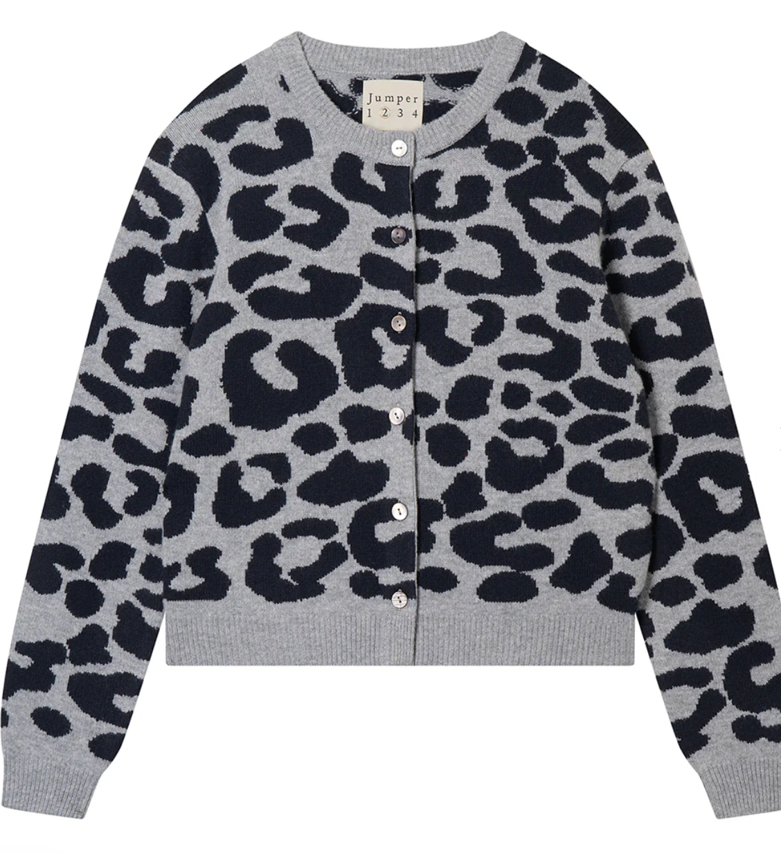 - Details: Jumper 1234 merino cardigan, merino wool heavier weight all over leopard jacquard round neck cardigan in mid grey and navy, true to size, first time Jumper has offered 100% merino
