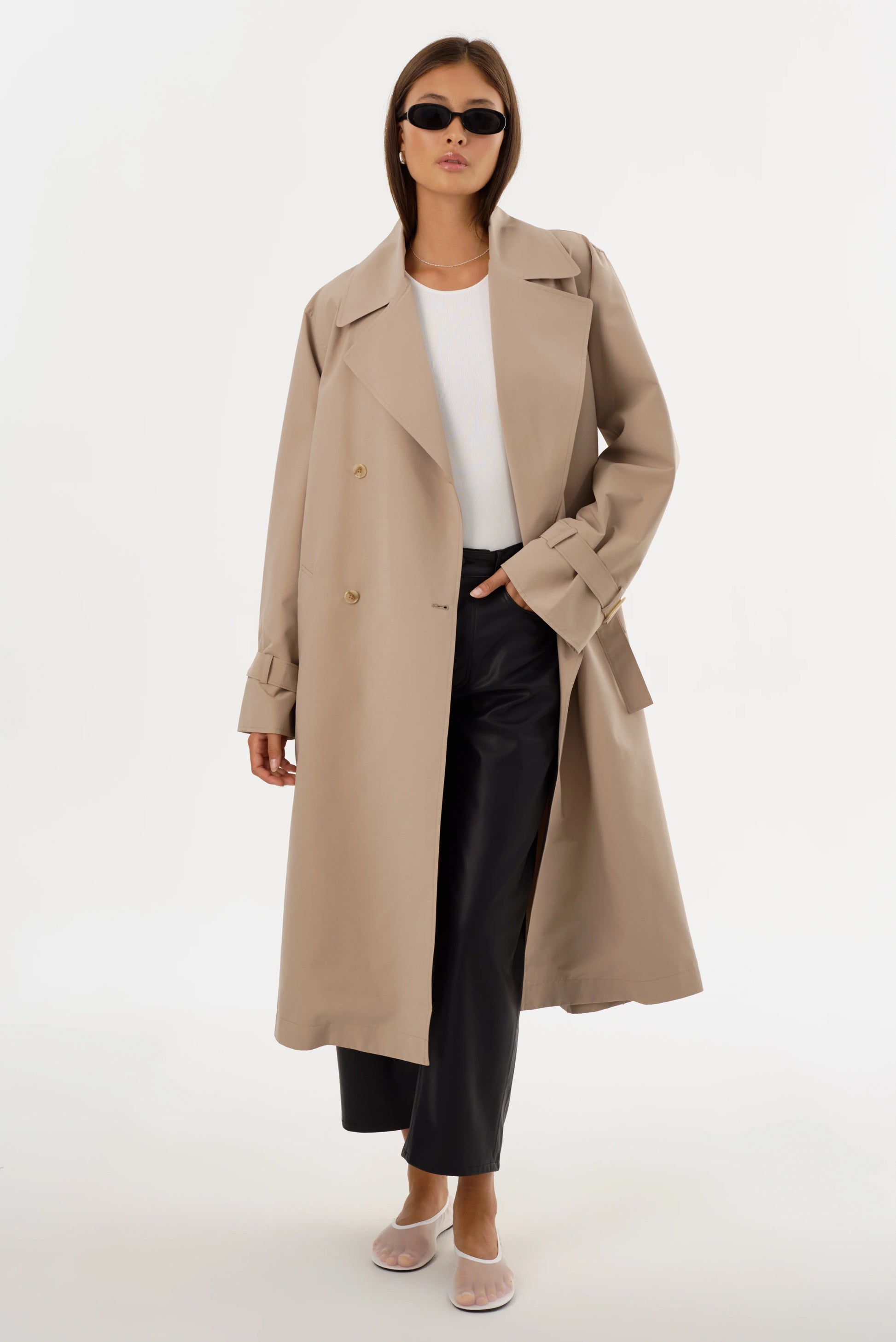 - Details: The Colette Oversized Trench Coat combines timeless trench design with a contemporary edge, featuring a double-breasted button closure, self waist tie, and wide sleeves with buckle detailing, it offers a relaxed yet refined silhouette, a perfect transitional piece, it effortlessly layers over any outfit for an elevated touch