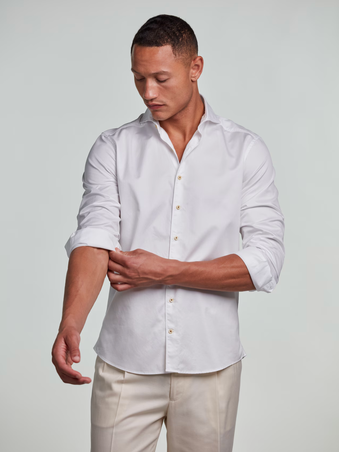 - Details: This twill shirt is made of twofold cotton, the shirt is detailed with mother of pearl buttons, single cuffs and a cut away collar