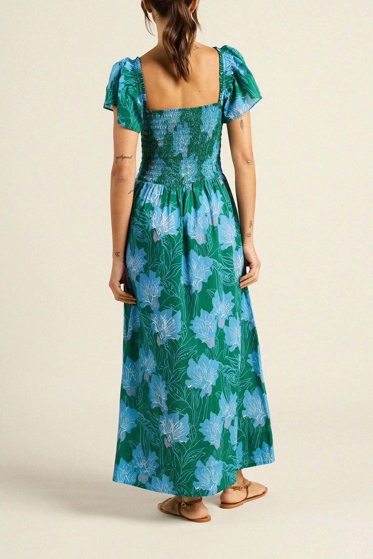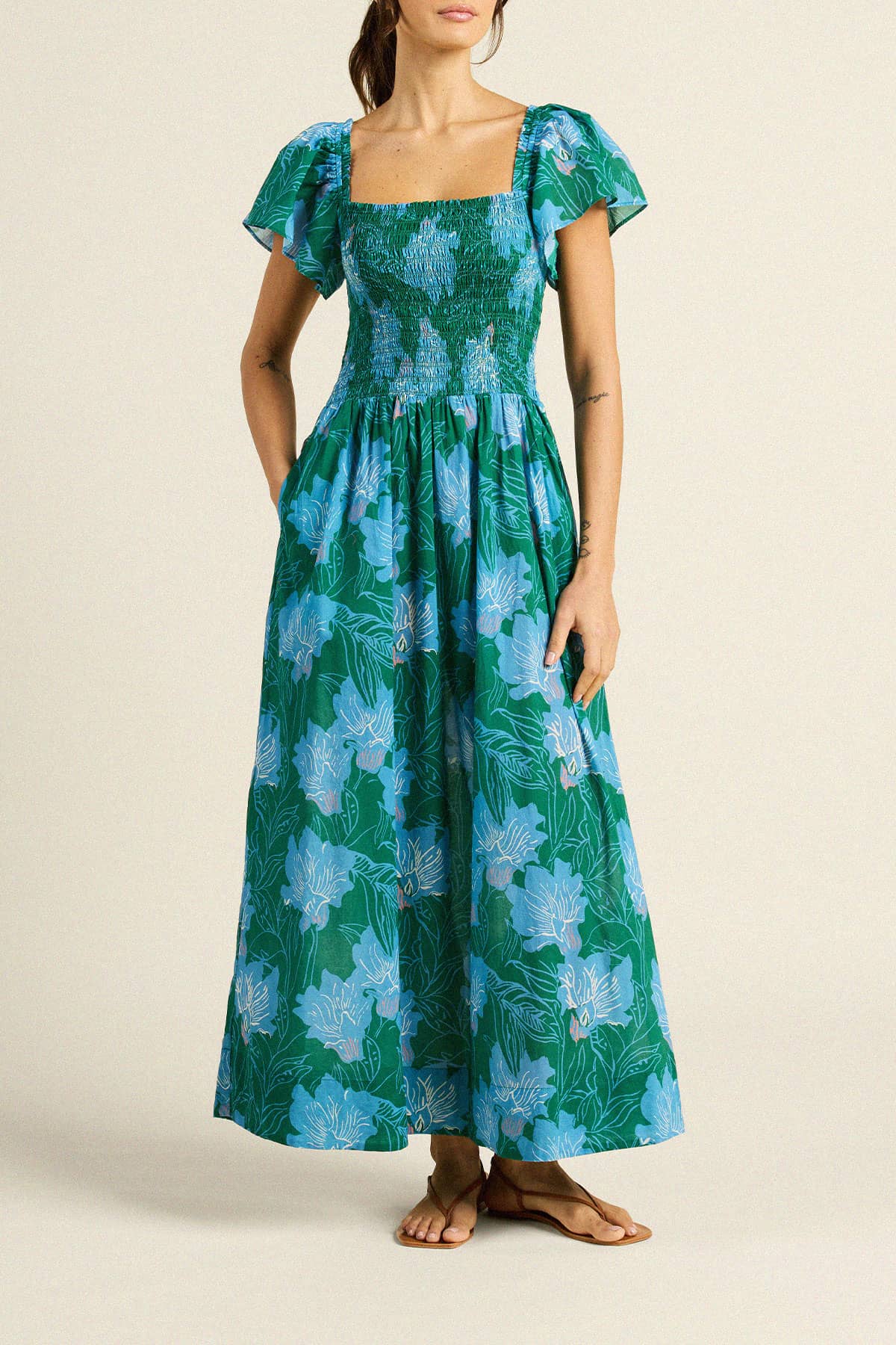 - Details: The Esme Dress is an elongating maxi dress with a smocked bodice that provides a comfortable fit, the neckline is finished with delicate ruffle trim and subtle fluttering sleeves that provide flattering shoulder coverage, finished with Trovata's signature hidden side seam pockets