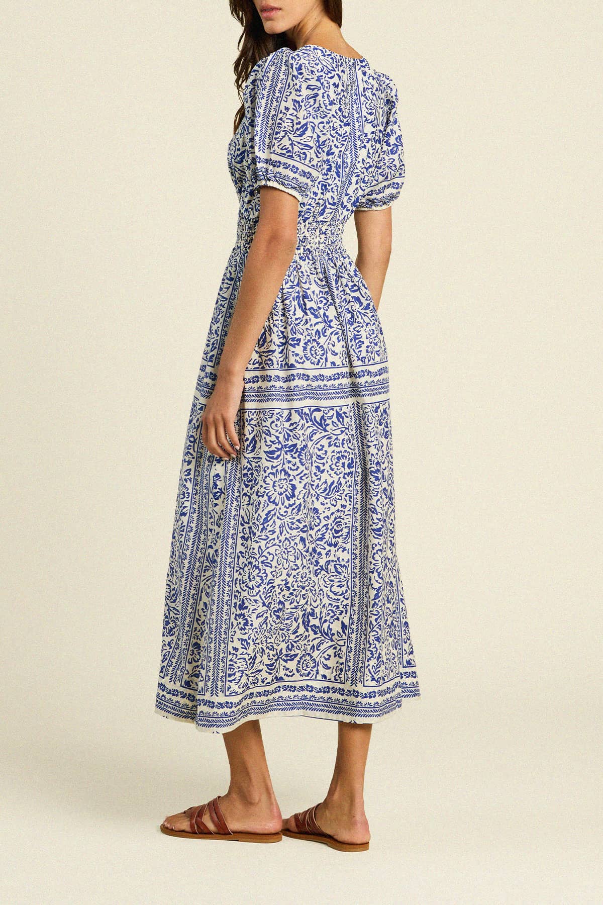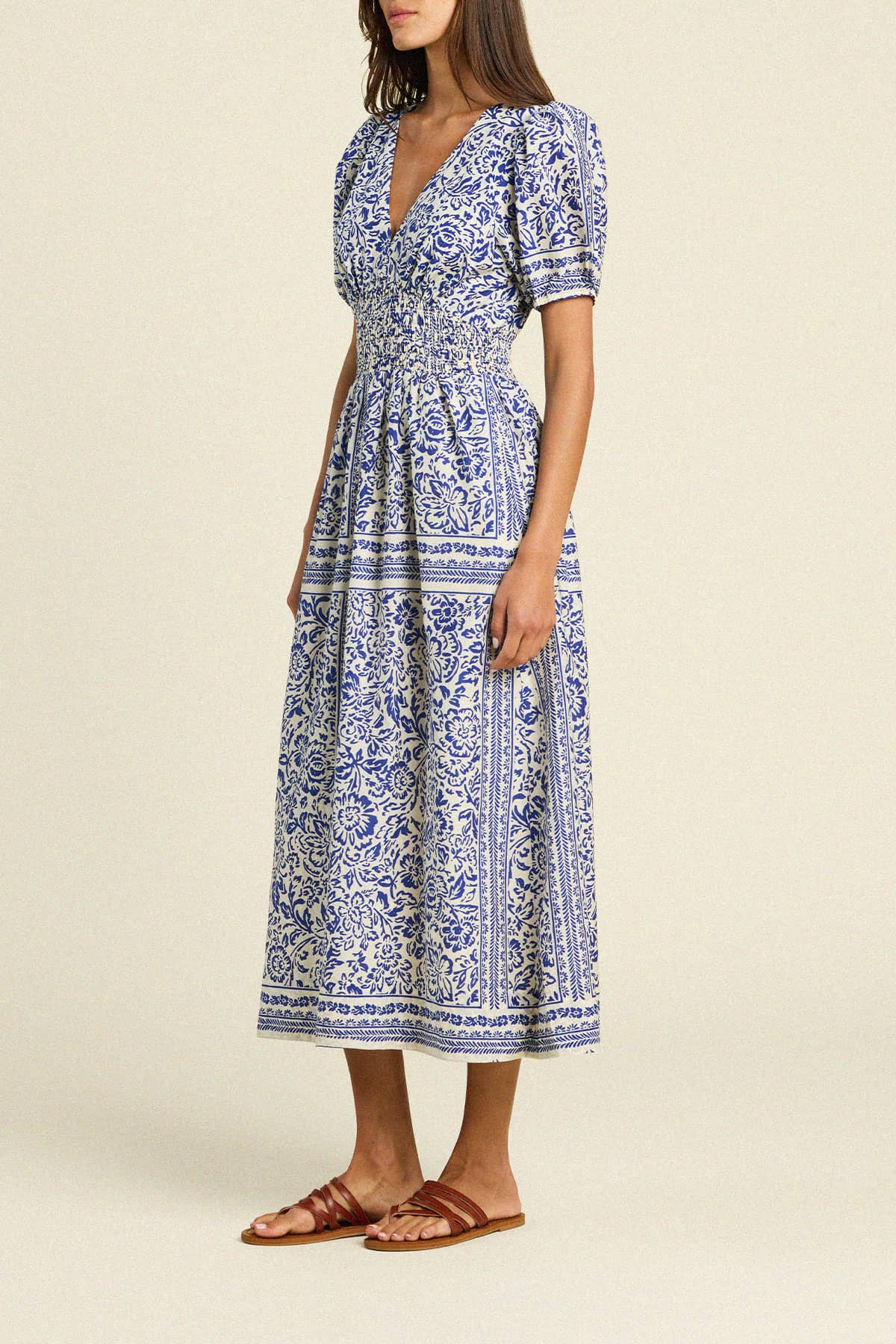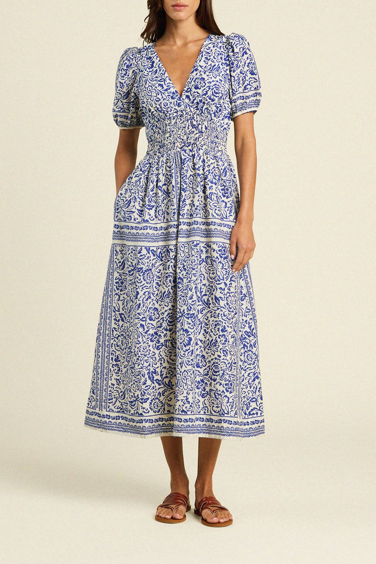 - Details: The Sonia Dress is a simplified midi-length dress with a flattering v-neckline and a smocked elastic waist for a comfortable fit, short puffed sleeves add a playful touch, while the slim waist and straight skirt offer a clean sense of minimalism and Trovata's signature hidden side seam pockets for practicality